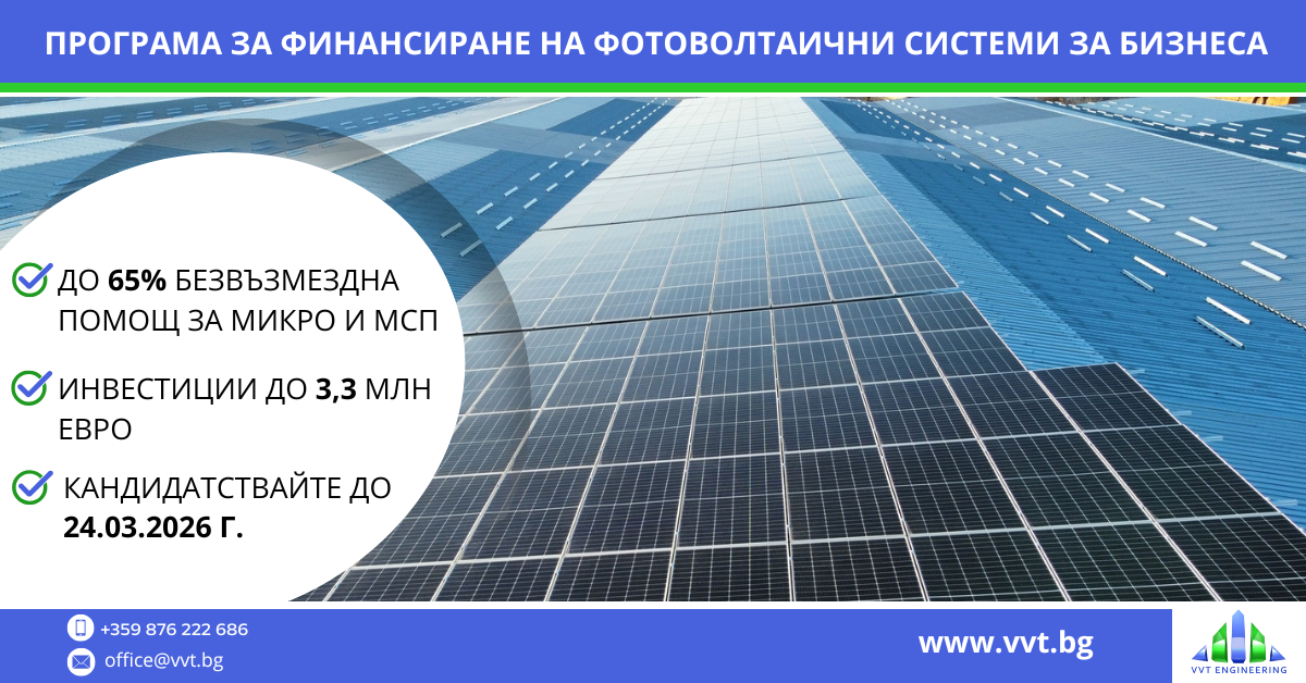 Малките и средни предприятия в България имат отлична възможност да инвестират в устойчива енергия с до 65% безвъзмездна финансова помощ. Отворена е програма, насочена към изграждане на фотоволтаични централи – както за продажба на електроенергия, така и за собствено потребление в комбинация с батерийни системи.